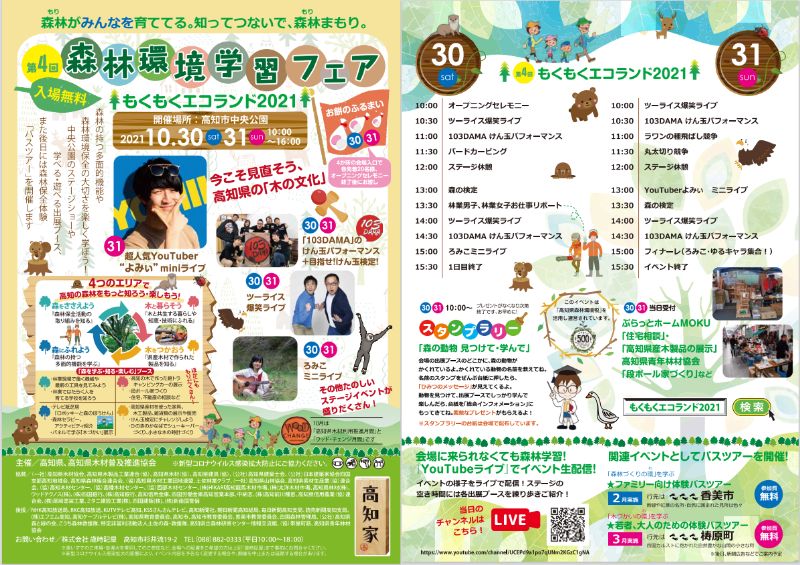 「もくもくエコランド2021 第4回森林環境学習フェア」は、令和3年10月30日(土)及び10月31日(日)に、高知市中央公園にて開催します。ご来場をお待ちしています。