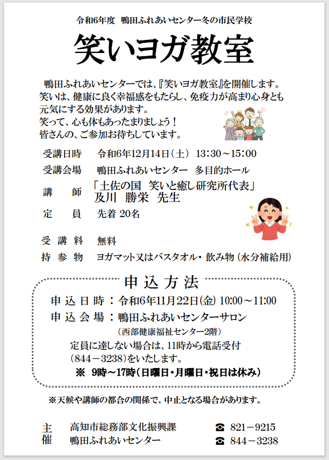 笑いは、健康に良く幸福感をもたらし、免疫力が高まり心身とも元気にする効果があります。笑って、心も体もあったまりましょう!皆様のご参加お待ちしています。