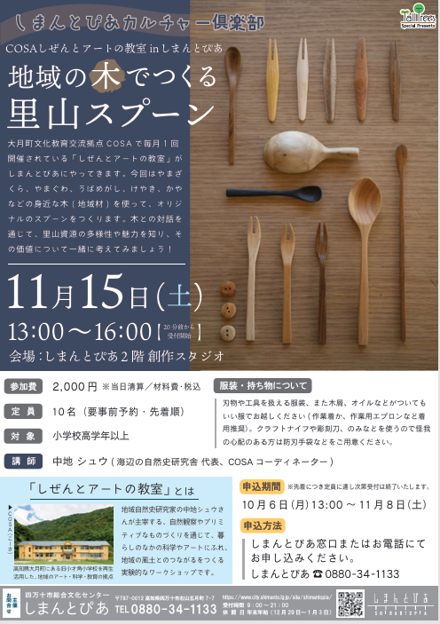 大月町文化教育交流拠点COSA で毎月1 回開催されている「しぜんとアートの教室」がしまんとぴあにやってきます。今回はやまざくら、やまぐわ、うばめがし、けやき、かやなどの身近な木( 地域材) を使って、オリジナルのスプーンをつくります。木との対話を通じて、里山資源の多様性や魅力を知り、その価値について一緒に考えてみましょう!