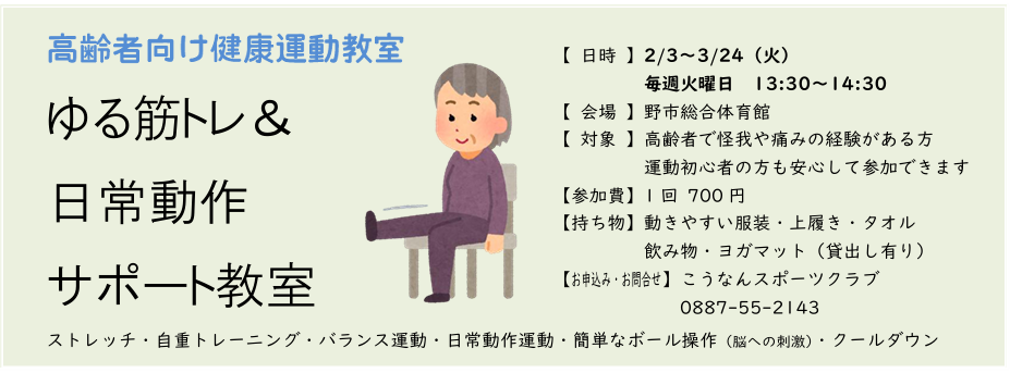 【持ち物】動きやすい服装・上履き・タオル 飲み物・ヨガマット(貸出し有り)