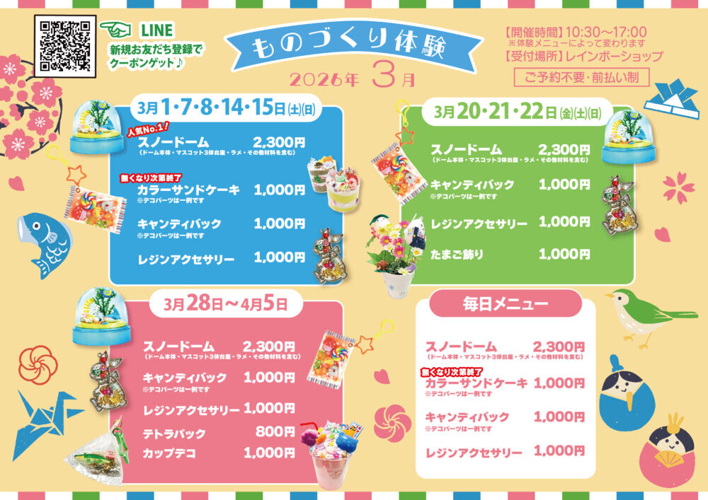 3月はスノードーム・キャンディバック・カラーサンドケーキ(無くなり次第終了)・レジンアクセサリーからいずれかのメニューが開催されます。