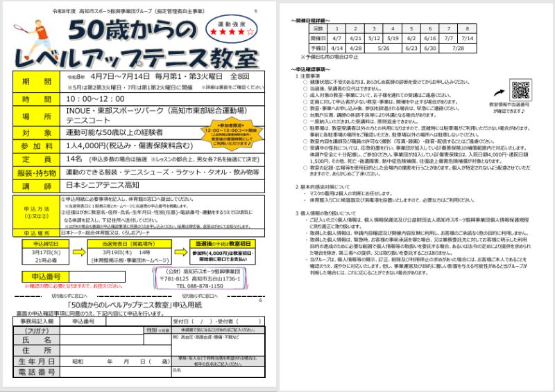 目的:高知市民の健康増進と運動意欲を高め、スポーツの継続活動への機会づくりとする。また事業団グループ開催のテニス教室参加者やテニス経験者を対象として、技術指導による技術向上を目的とする。