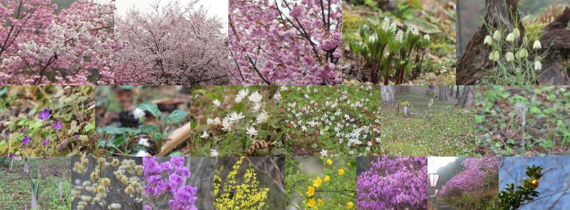 コヒガンザクラ(小彼岸桜)2枚、ヨウコウ(陽光)、ヒトリシズカ、バイモ、オオミスミソウ、ハルトラノオ、
