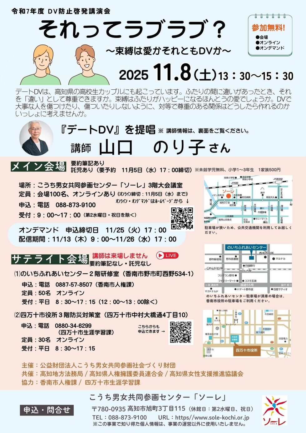 定員 : (1) メイン会場(高知市「ソーレ」):100名 (2) サテライト会場(香南市「のいちふれあいセンター」):50名 (3) サテライト会場(四万十市「四万十市役所」):30名 ※先着順・予約優先