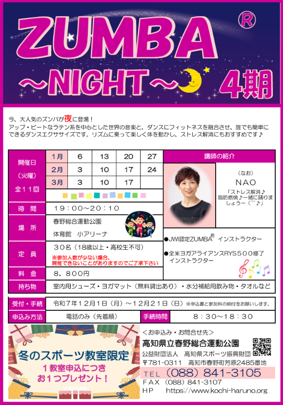 大人気のズンバを夜に開催!アップビートな音楽に乗せ、フィットネスを融合させたダンスエクササイズです。