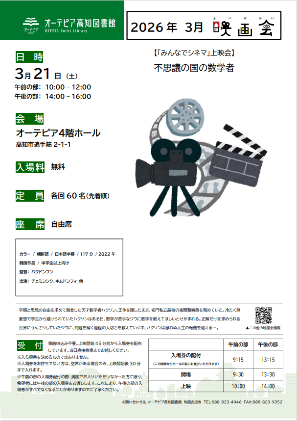 【お問い合わせ】オーテピア高知図書館 映画会担当 電話:088-823-4946 FAX:088-823-9352