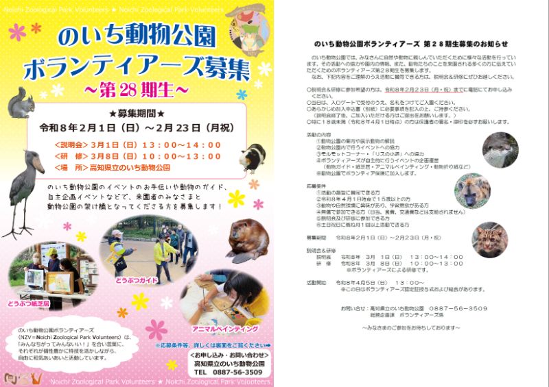のいち動物公園のイベントのお手伝いや動物のガイド、自主企画イベントなどで、来園者のみなさまと動物公園の架け橋となってくださる方を募集します!