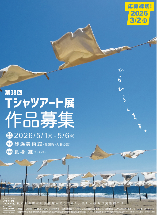 子どもから大人まで、ご応募いただいたデザインは全て、砂浜美術館がTシャツにプリント。第38回Tシャツアート展で“ひらひら”した後、世界にひとつだけのオリジナルTシャツを、潮風の香りとともにあなたにお届けします。