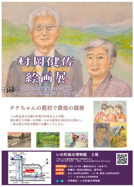 いの町在住の91歳の作者、村岡健佐氏が70年あまりの間、描き続けた洋画・日本画・はがき絵等を約100点を3日間展示し、一部を除き作品を無料でお譲りします。