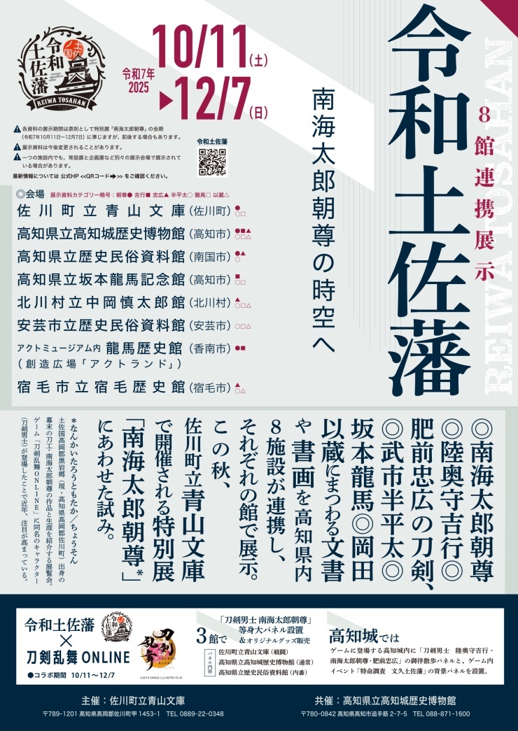 佐川町立青山文庫の特別展「南海太郎朝尊」にあわせ開催する8施設連携展示「令和土佐藩」でも刀剣乱舞ONLINEとの連携コラボを実施! 「刀剣男士 南海太郎朝尊」の等身大パネルを高知城歴史博物館(通常)と、高知県立歴史民俗資料館(内番)にて展示、「令和土佐藩」コラボグッズも販売! ▼詳細はこちら https://www.kochi-johaku.jp/column/8420/ 当館のコラボ関連企画 ①南海太郎朝尊の短刀1振、肥前忠広の刀2振を展示 ②「刀剣男士 南海太郎朝尊」等身大パネル(内番)を設置 設置期間:10月11日(土)~12月7日(日) ※コラボ期間中のみの設置となります。当館の企画展会期とは異なりますのでご注意ください。 設置場所:2階エントランスホール ③コラボ関連グッズの販売 ※詳細は追ってお知らせします。 他にも、平成24年度開催の特別展図録『刀 武士の魂』より、当館が収蔵する刀剣を抜粋・再構成したパンフレット(20ページ程度、A4、フルカラー)を刊行予定です。今回展示する南海太郎朝尊の短刀1振、肥前忠広の刀2振も掲載します。詳細は追ってお知らせします。